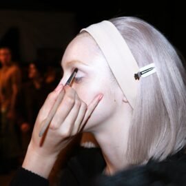 This all depends on exactly what you want to do. “Mind the resistance,” Vincent says, particularly if you’re looking for uniform color across the lid. “I tend to recommend a blender brush, which is the brush that looks like a feather duster. If you do it with a stiff brush, you’re defeating yourself before you even start. The joy of a wet-to-dry is you have to get it right amount of product loaded up, and then it blends itself. If the brush is too stiff, it will leave the shadow streaky and then much harder to control.”